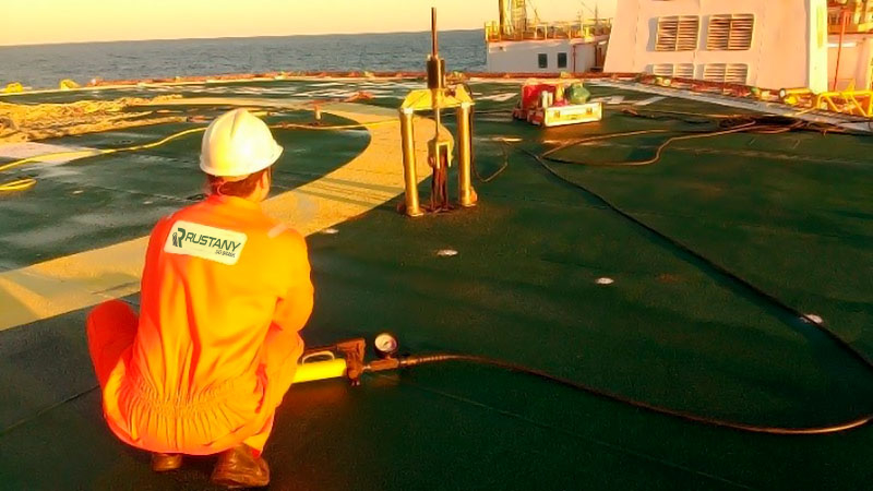 Com sistema próprio, desenvolvidos pela equipe de Engenharia da Rustany, realizamos o teste de impacto nas telas do helideck e teste de carga nas búricas (elos de amarração), com o mais alto padrão de segurança e nas normas vigentes.